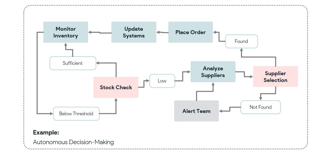 While this might sound like traditional workflow automation, the agent approach fundamentally differs. Rather than following rigid, pre-programmed rules, agents operate based on high-level goals and objectives. A supply chain agent might be given goals like "maintain sufficient inventory to meet demand" and "minimize holding costs" while "ensuring reliable delivery times." The agent then determines how best to achieve these potentially competing objectives. It can adapt its strategies based on changing conditions - perhaps shifting to prioritize reliability during supply chain disruptions, or adjusting ordering patterns based on emerging demand trends. This goal-oriented flexibility stands in stark contrast to traditional automation systems that simply execute predefined logic chains.